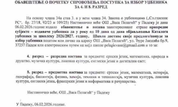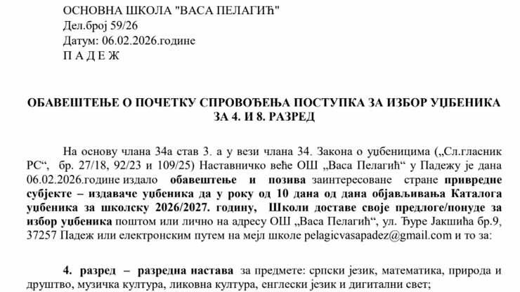 ОБАВЕШТЕЊЕ О ПОЧЕТКУ СПРОВОЂЕЊА ПОСТУПКА ЗА ИЗБОР УЏБЕНИКА ЗА 4. И 8. РАЗРЕД