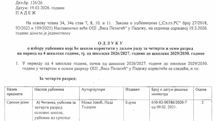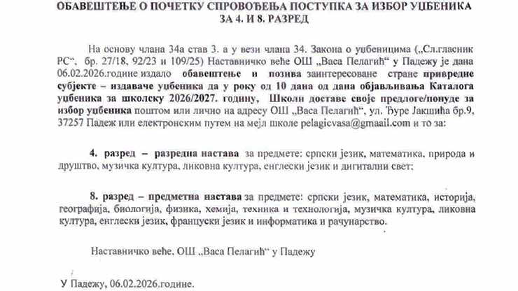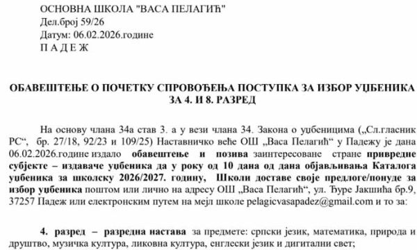 На основу члана 34а став 3, а у вези члана 34. Закона о уџбеницима („Сл. гласник РС“, бр. 27/18, 92/23 и 109/25), Наставничко веће ОШ „Васа Пелагић“ у Падежу је дана 06.02.2026.<a class="moretag" href="https://osvasa.edu.rs/obavestenje-o-pocetku-sprovodjenja-postupka-za-izbor-udzbenika-za-4-i-8-razred/">Даље...</a>